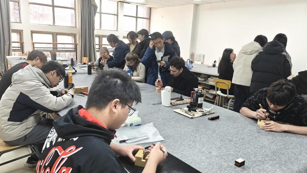 在篆刻实践课上,中外师生在专业教师指导下动手创作,学习汉字演变、字形结构分布及笔画转折技巧。当亲手完成的印章盖下印蜕时,大家互相展示作品、分享感悟,直观触摸到中华传统文化的精神肌理,更在一笔一刀的镌刻中,体会了篆刻艺术所承载的文字形态与意境。