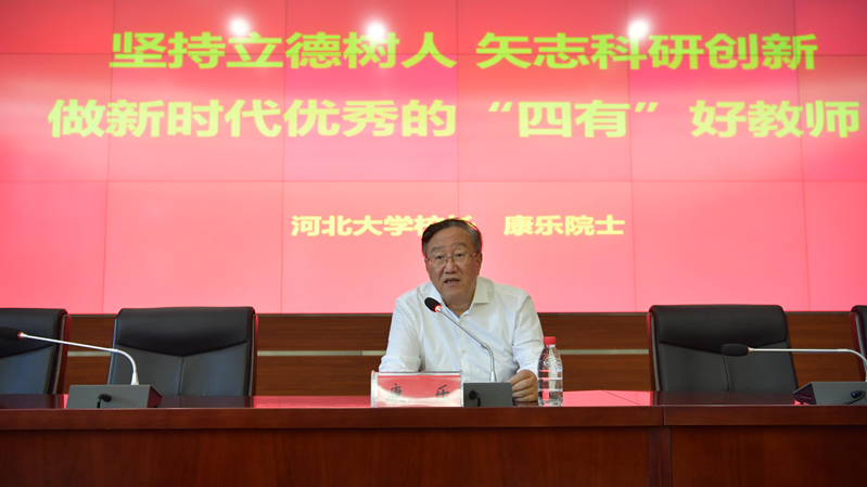 校长康乐院士用整整80分钟的时间,为新教师开启了《坚持立德树人,矢志科研创新,做新时代优秀的“四有”好教师》第一讲。康校长结合自己的教学科研经历,谈到平台对个人事业发展的重要性,从河北大学的历史,谈到建校近百年来事业发展的辉煌成就,谈到学校进入“部省合建”序列以来通过改革薪酬分配制度、健全学科和科研体制机制为广大教师搭建广阔平台的举措,重点围绕“如何成为一名新时代优秀的‘四有’好教师”,从“坚持立德树人,践行为党育人、为国育才的初心使命”“尽快转变角色,开启发展自我、成就自我的学术人生”“心中长存敬畏,追求热心从教、潜心治学的事业境界”三方面分享了经验和看法,对新入职教师提出“把奉献国家作为自己的坚定理想,把立德树人作为自己的终身事业,把科研创新作为自己的动力之源,做新时代有理想信念、有道德情操、有扎实知识、有仁爱之心的好老师”的殷切期望。