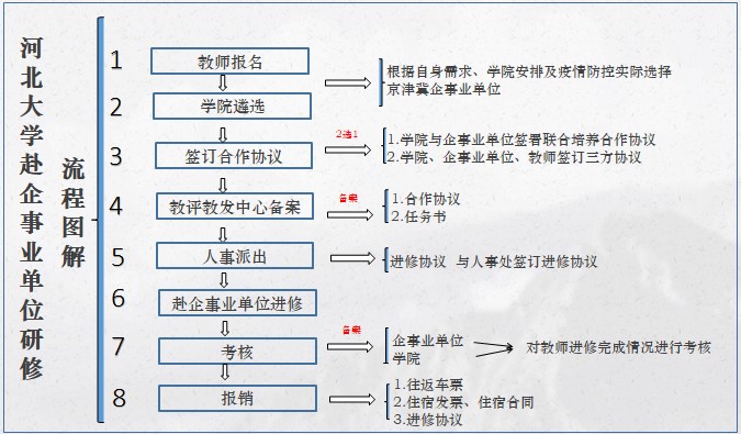进修教师填写《河北大学教师赴企事业单位实践进修任务书》(附件2)《河北大学青年教师赴企事业单位实践进修协议书》(附件3),各教学单位汇总填写《河北大学教师赴企事业单位实践进修汇总表》(附件4),教评教发中心协助办理校内审批备案手续。