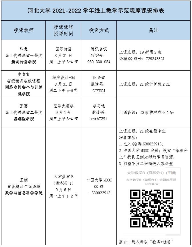 具体授课时间、方式、准备事项等详见《河北大学2021-2022学年线上教学示范观摩课安排表》。