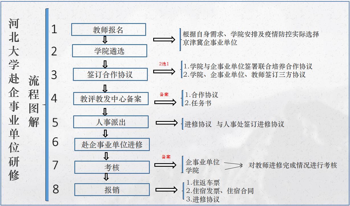 进修教师填写《河北大学教师赴企事业单位实践进修任务书》(附件2)《河北大学青年教师赴企事业单位实践进修协议书》(附件3),各教学单位汇总填写《河北大学教师赴企事业单位实践进修汇总表》(附件4),教评教发中心协助办理校内审批备案手续。
