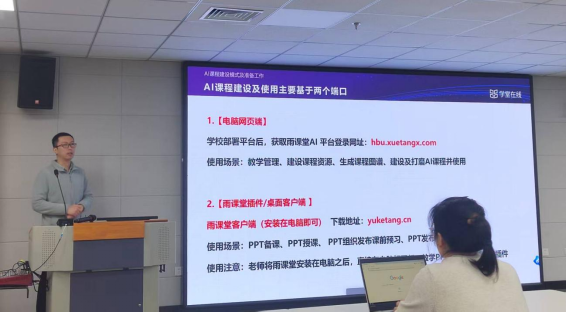 11月6日至13日,学校组织开展基于雨课堂平台的智慧课程建设工作坊。清华大学学堂在线培训师许腾介绍了雨课堂升级AI功能实操演示以及智慧课程建设优势,演示雨课堂在课前-课中-课后的有效应用,带领教师进行AI课程建设实操。