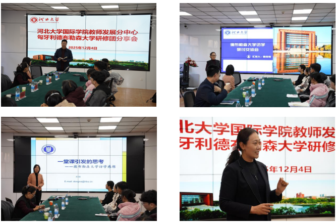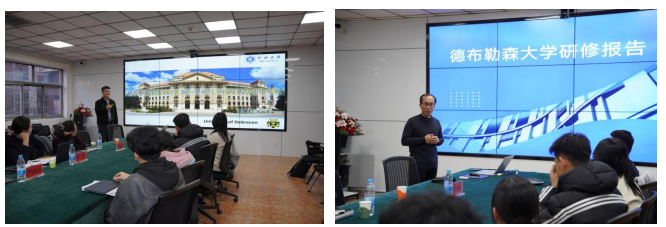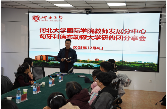 12月4日,匈牙利德布勒森大学教师研修团分享会在国际学院303会议室举行。本次分享会邀请外国语学院副院长高华、大学数学部主任鲍俊艳、计算机教学部教师邓娜、经济学院教师朱永亮和电子信息工程学院教师张云飞参加,会议由国际学院副院长尹成远主持。