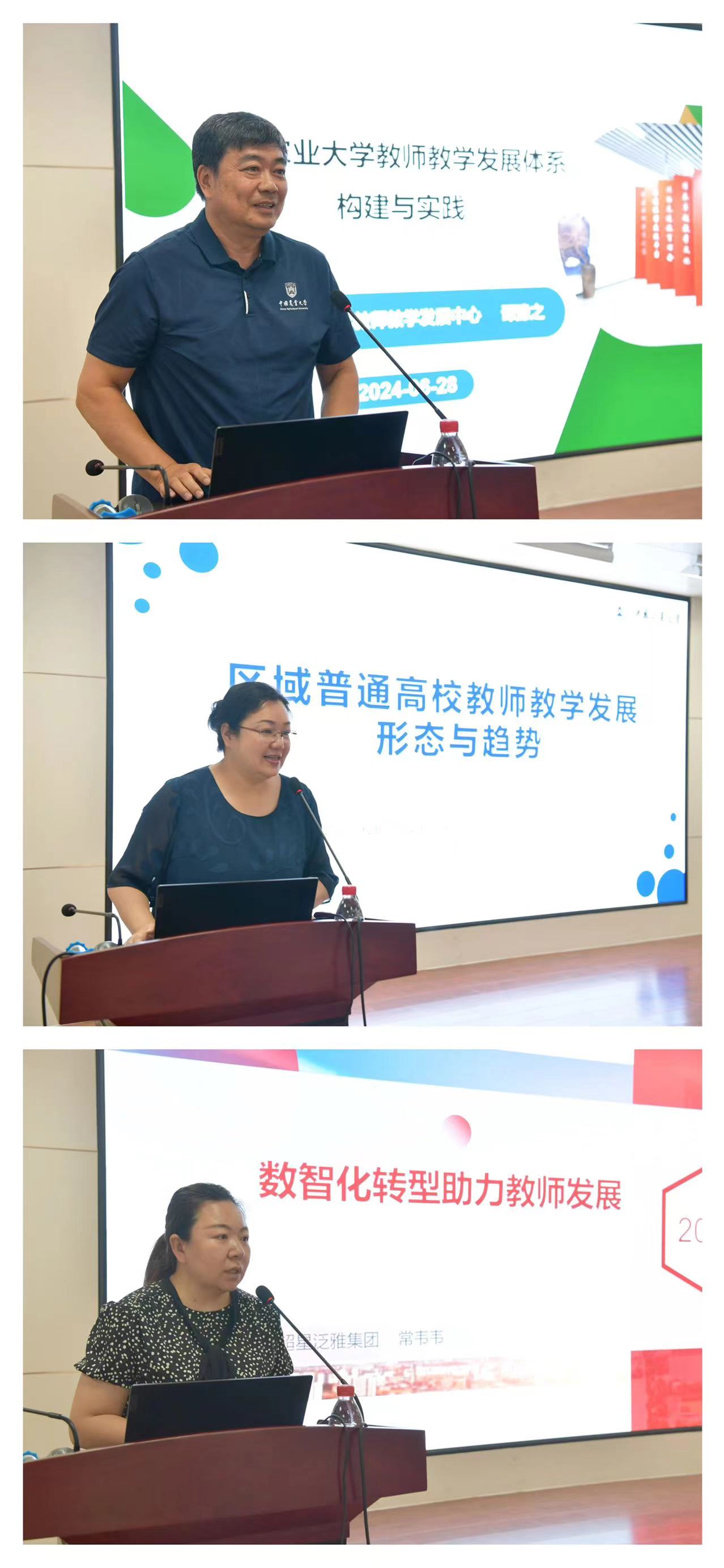 主题报告和研讨环节,中国农业大学教师发展中心主任谭豫之教授,中国计量大学高等教育研究所副所长、教务处副处长、创业学院副院长赵春鱼副研究员,超星教师发展研究院产品总监常韦韦分别以《中国农业大学教师教学发展体系构建与实践》《省域普通高校教学发展的形态与趋势》《数智化助推教师发展》为题作报告。