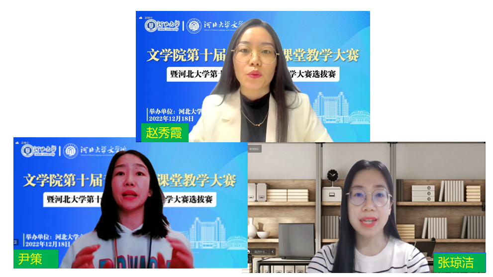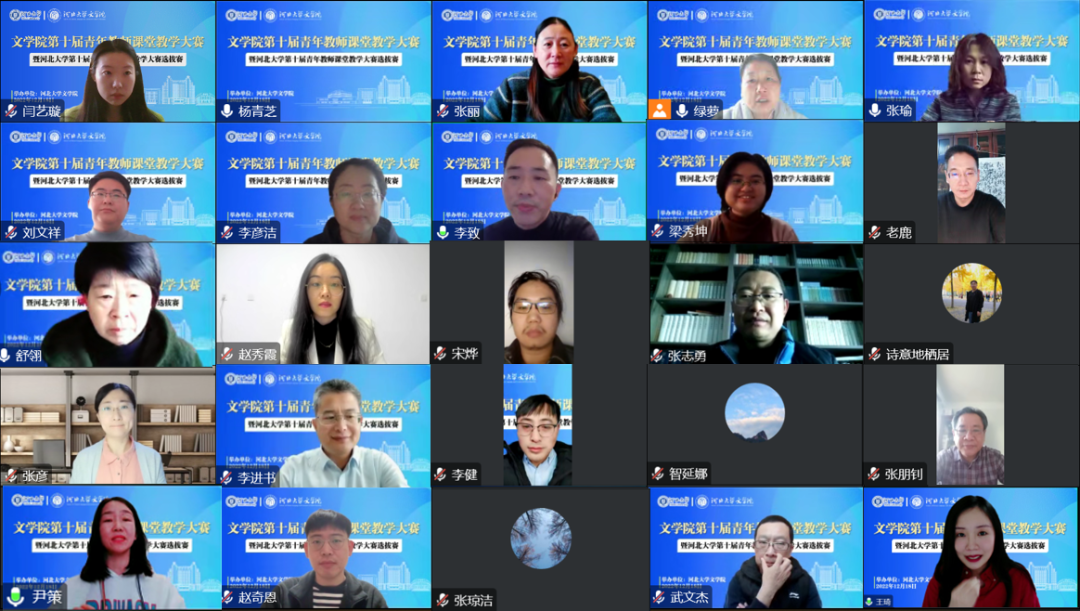 为贯彻落实立德树人根本任务,强化本科教学中心地位,提高青年教师教学水平,12月18日上午,文学院举行第十届青年教师课堂教学大赛暨校赛选拔赛。学院领导、教研室主任、教学督学等担任评委,教学经验丰富的教师代表吴淑玲、全国教师教学创新大赛一等奖获得者王琦、全国青年教师课堂教学大赛二等奖获得者张彦、“百家讲坛”名师韩田鹿、河北大学青年教师课堂教学大赛一等奖获得者徐世权等5位教师担任点评。教学大赛采用线上方式举行,由文学院副院长李致主持。