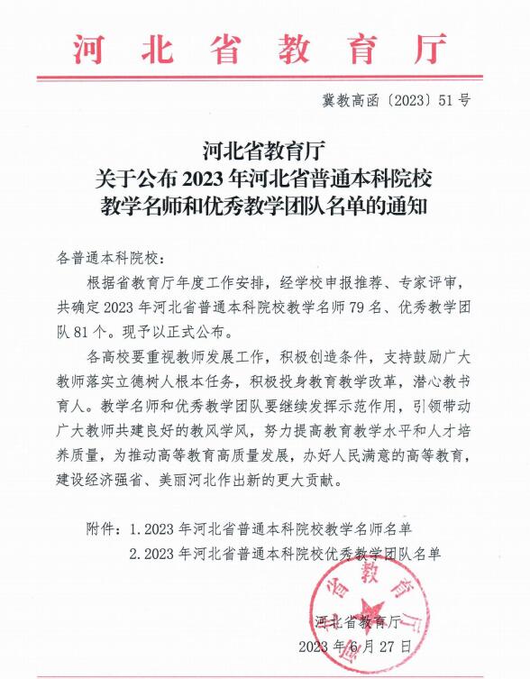 近日,河北省教育厅发布《关于公布2023年度河北省普通本科院校教学名师和优秀教学团队名单的通知》(冀教高函【2023】51号),我校韩立新、吕志堂、 方立德3位教授获批为省级教学名师,教育学专业教学团队、光电信息科学与工程专业教学团队、卫生检验教学团队3个团队获批为省级优秀教学团队。