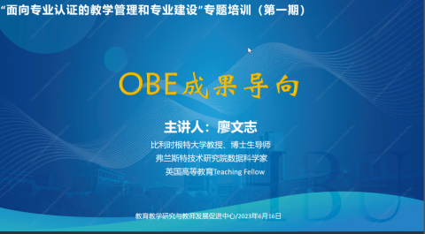 2023年6月16日,第一期培训正式开班。本次培训以“OBE成果导向”为主题,邀请比利时根特大学廖文志教授作了线上培训,分三期进行,持续到6月28日完成。廖教授以“OBE教育理念中老师如何有效的教”“老师和学生如何有效地沟通”为题,详细介绍了OBE理念的起源、发展及理论基础,阐述了其与传统教育的区别,用生动实例深刻解释了OBE理念对人才培养的重要作用,并通过小组讨论方式现场分析了教学策略和交流沟通技巧。