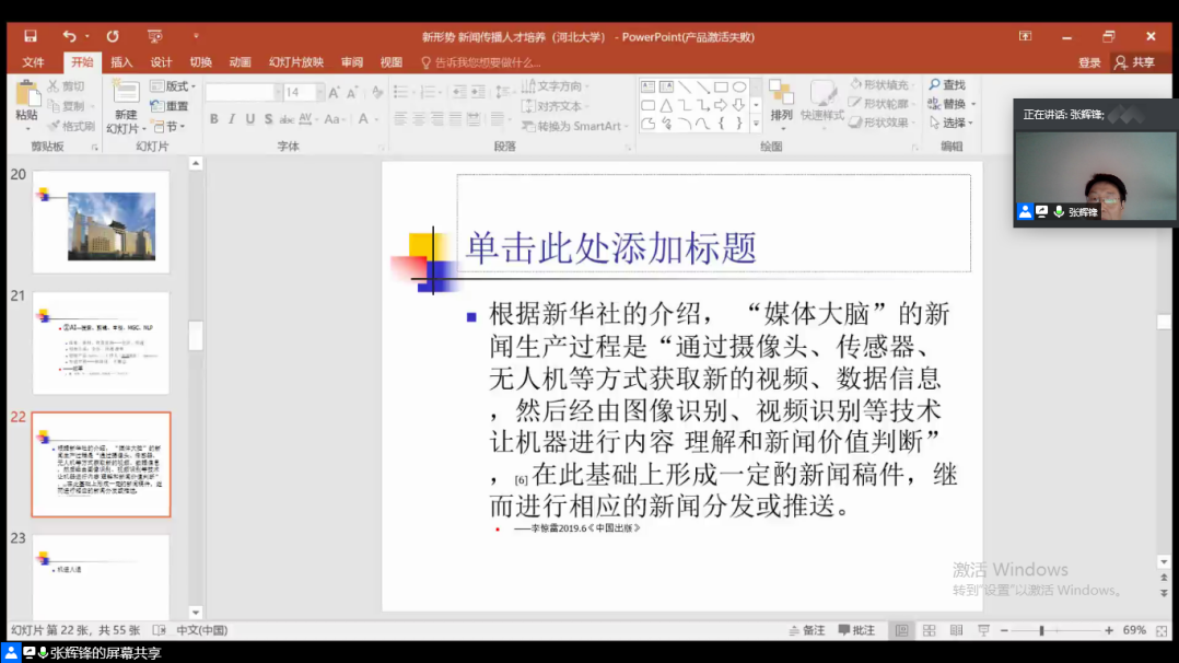根据学校“名师面对面”活动安排,5月15日上午9:00-10:30,新闻传播学院邀请中国人民大学新闻学院副院长、传媒经济研究所所长、新闻与社会发展研究中心研究员张辉锋教授通过腾讯会议平台为新闻传播学院师生做了题为“新形势&新闻传播人才培养转型”的精彩报告。讲座由新闻传播学院院长韩立新教授主持,来自河南大学、内蒙古大学、北京青年政治学院、唐山学院和我院师生共计一百二十余人参加本次主题讲座。