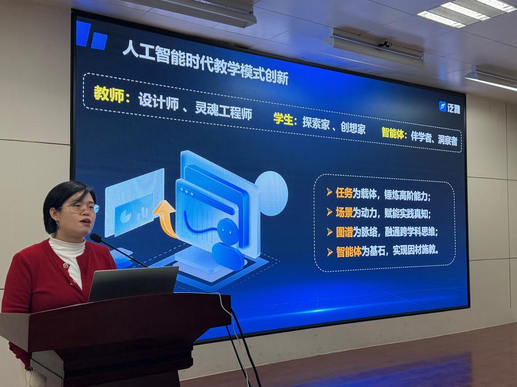 超星集团智慧课程产品总监赵玉霞以《教学创新报告中的AI融合与思政浸润思路》为题作报告。聚焦“为什么融、在哪里融、怎么融”等关键问题,从AI时代的智慧教学创新与变革、教学全流程的AI融入思路、精准定位一致对准的思政设计等三个方面进行分享。