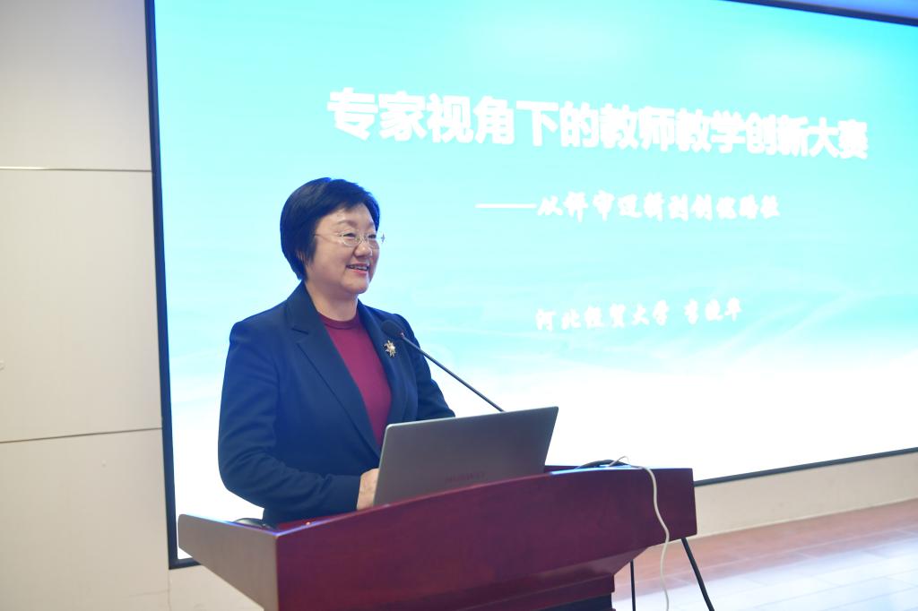河北经贸大学党委书记李晓华教授以《专家视角下的教师教学创新大赛—从评审逻辑到创优路径》为题作报告,报告紧扣高等教育创新发展主线,从大赛总体情况、评审逻辑解析和备赛核心路径等三个方面进行阐述。