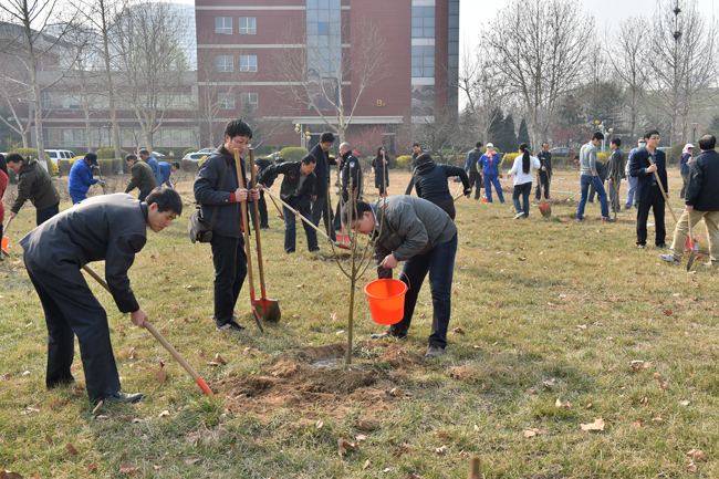 学校领导王余丁、王培光、杨立海、张彦勤、任德亮均以普通党员身份带头参加本次活动,他们与机关党员们融为一体,共同劳动。在新校区科教园区A2座与B2座之间的中央绿化带,党员们分工协作,相互配合,有的栽苗培土,有的接水浇树,经过大家齐心协力的劳动,为科教园区的海棠园新添西府海棠60株。随后机关20余名年轻男党员又奔赴生活园区,面对砖石众多、坚硬难挖的地面环境,小伙子们干劲十足,艰苦奋战,克服困难,共同为厚朴楼挖出备用树坑20多个。