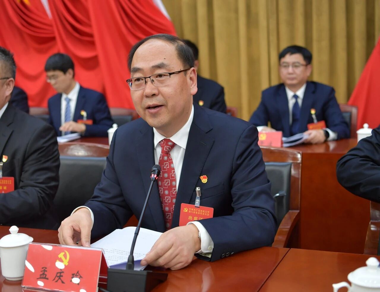 报告厅内气氛庄严热烈,主席台上方悬挂着“中国共产党河北大学第八次党员代表大会”的会标,帷幕正中的中国共产党党徽在鲜艳的红旗映衬下熠熠生辉。会场里悬挂着“以习近平新时代中国特色社会主义思想为指导,凝心聚力,改革创新,奋力谱写一流高水平大学建设新篇章!”的条幅。