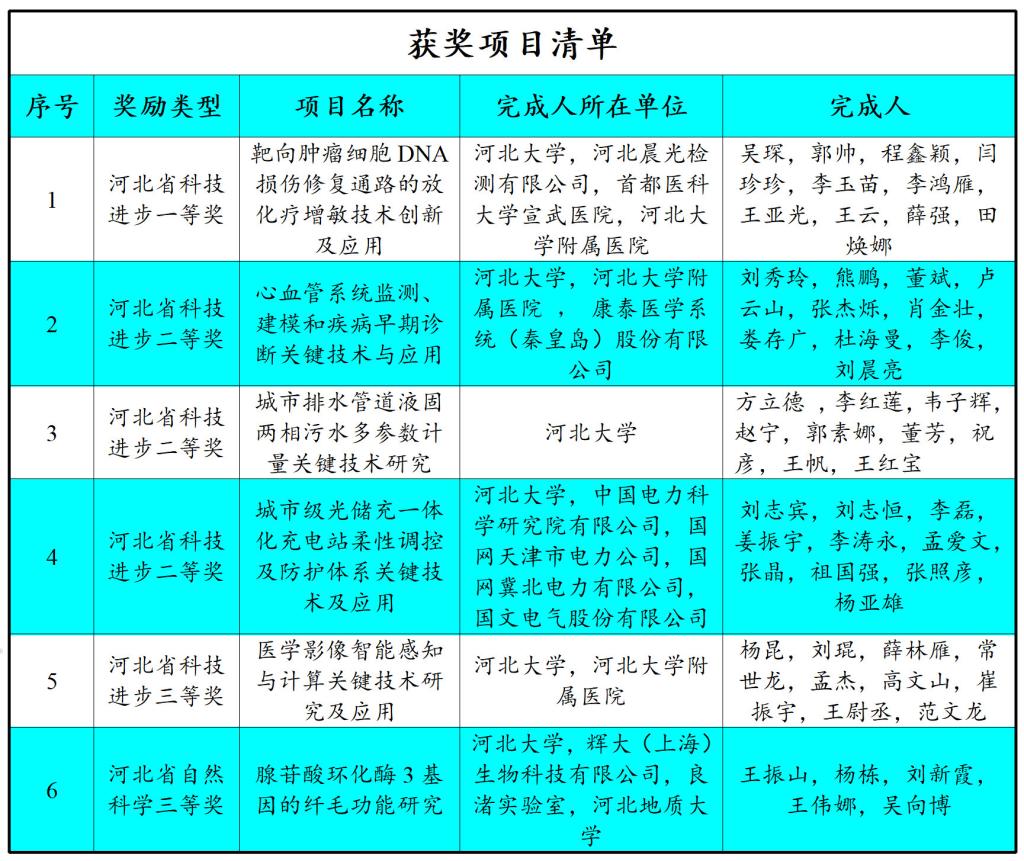 会议对在推动河北省科学技术进步和经济社会发展中作出突出贡献的单位和个人进行了表彰。河北大学共获2025年度河北省科学技术奖6项(详见获奖清单),其中一等奖1项、二等奖3项、三等奖2项。学校获奖项目团队,在促进制造业转型升级、服务经济社会高质量发展、保障人民生命健康等方面做出了积极贡献。